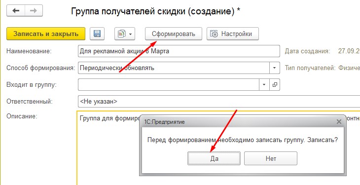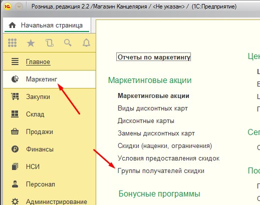 Заходим в Маркетинг – Маркетинговые акции – Группы получателей скидки.