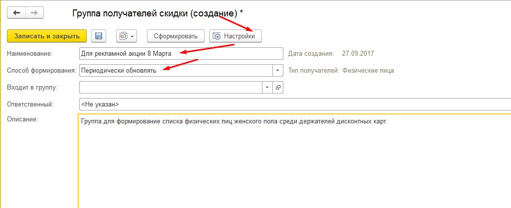 Зачем нужны группы получателей скидки и как правильно настраивать взаимодействие этих групп и маркетинговых мероприятий в магазине. Основное значение группы получателей скидки состоит в формировании списка лиц которым будет предоставляться скидка с какими то условиями, а так же автоматическое обновление этой группы. К примеру мы возьмем группу физических лиц, этой группой будут женщины с дисконтными картами, что бы в последующем предоставить им скидку на 8е марта.
