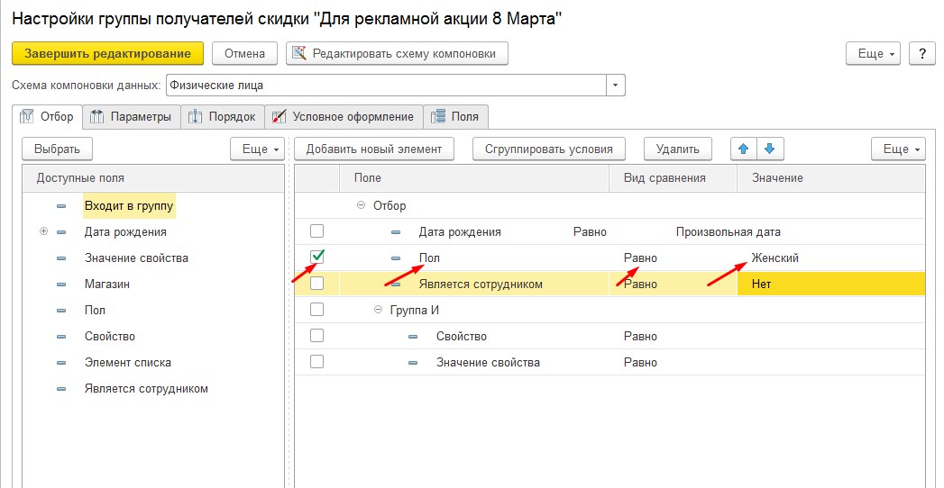 Выходит отчет по нашим прекрасным дамам, которые 8го марта порадуются дополнительной скидке! В наши группы попали только женщины! То есть там где не указано физ лицо или мужчины исключаются. Мы задали очень строгое соответствие пола "РАВНО".Теперь давайте посмотрим как пользоваться Группой в Скидке. Создаем новую скидку, заполняем закладку Главное.