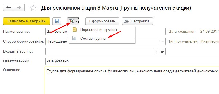 Теперь проверим наши группы получателей скидки, для этого нажимаем кнопку Отчеты - Состав группы.