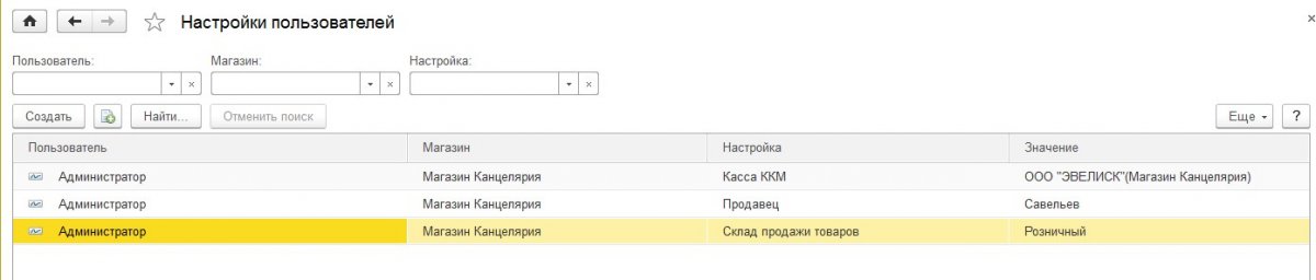 Данный вид настройки по умолчанию служит для детальной настройки пользователей в программе. Очень удобно если у вас несколько ККМ или пользователей, что бы настроить работу конкретного пользователя с конкретным магазином или складом.