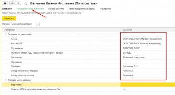 Переходим в Настройки пользователя! И задаем значение настроек, что бы продавцу не приходилось задавать в документах продажи эти данные. Каждому продавцу могут быть назначены разные настройки, в зависимости от его мета работы или функций в магазине.