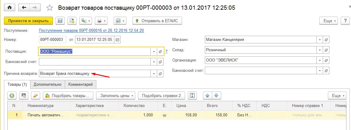 Заполняется Шапка документа и Табличная часть товаров, по которым производится возврат. Обратите внимание на Причину возврата! Они заполняются в Администрирование - Запасы и закупки - Аналитики хозяйственных операций!