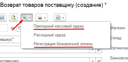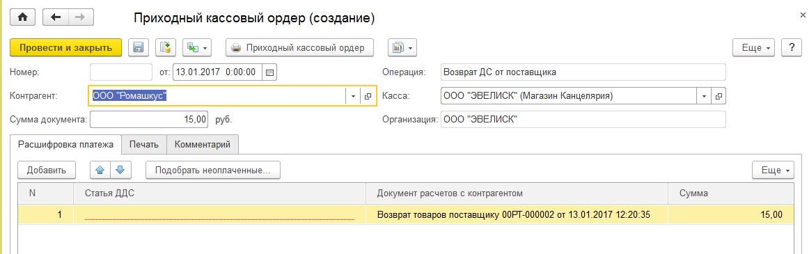 На основании документа Возврат товаров поставщику в 1С:Розница создается 3 документа. Документ Расходный ордер используется только при использовании ордерной схемы! Документы возврата денежных средств: Приходный кассовый ордер и Регистрация безналичной оплаты.Создаем Приходный кассовый ордер (ПКО), документ уже заполнен, осталось заполнить Статью ДДС(Движения денежных средств).