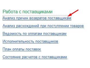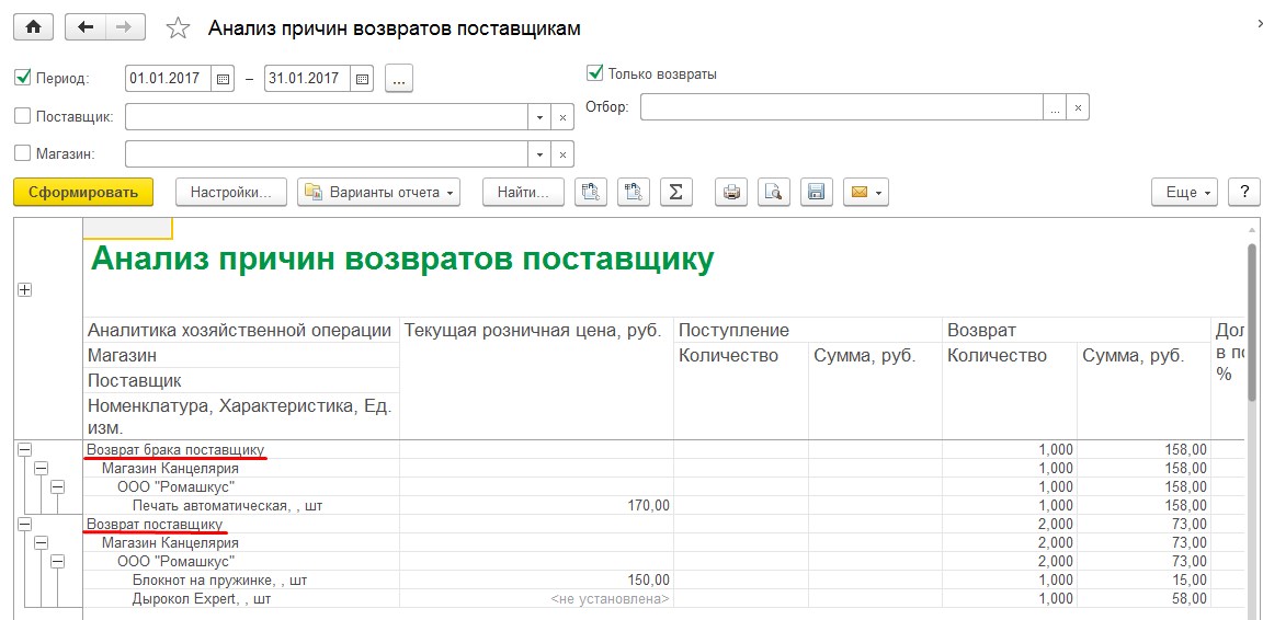 Формируем отчет с стандартными настройками. Как видно из отчета, Возврат барака поставщику и Возврат поставщику разные аналитики, по этому они сгруппированы в разные строки. Вы можете самостоятельно формировать Аналитики хоз операций, что бы проще было оценивать движения товаров в организации.Так же вы можете формировать документ Возврат товаров поставщику из документы Поступления товаров и услуг, к примеру когда вы обнаружили при приемки товаров брак и решили сразу же оформить возврат.