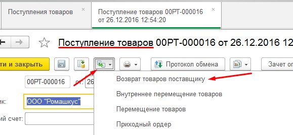 Документ Возврат товаров поставщику служит для регистрации операции по внешнему возврату.